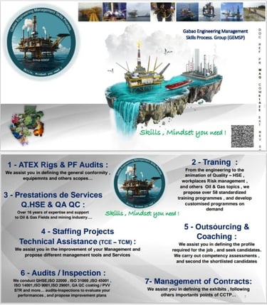 Depuis 2015, Gabao Engineering Management Skills Process Group est votre partenaire de confiance en matière de qualité, hygiène, sécurité et environnement (QHSE). Présents en République Gabonaise, au Sénégal et en Côte d'Ivoire, nous offrons des services de gestion de projets, de sécurité des sites, d'audit et inspection, de gestion des systèmes informatiques, ainsi qu'une assistance technique et administrative.